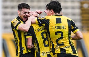 Heiderber Ramírez pudo conseguir una segunda jugada en la zona 14 para despertar las alarmas de la zaga blanquinegra, en la acción que terminaría inclinando la balanza hacia el lado aurinegro. Ramírez se la dio a Peñaranda para que agitara la varita y así lo hizo, conduciendo con la bocha pegada a su botín para ubicar a Villalpando en el sector de impacto. El uruguayo desenfundó el remate y sorprendió a propios y extraños, ajustando su tiro hacia el parante derecho de Roberts para abrir la pizarra.